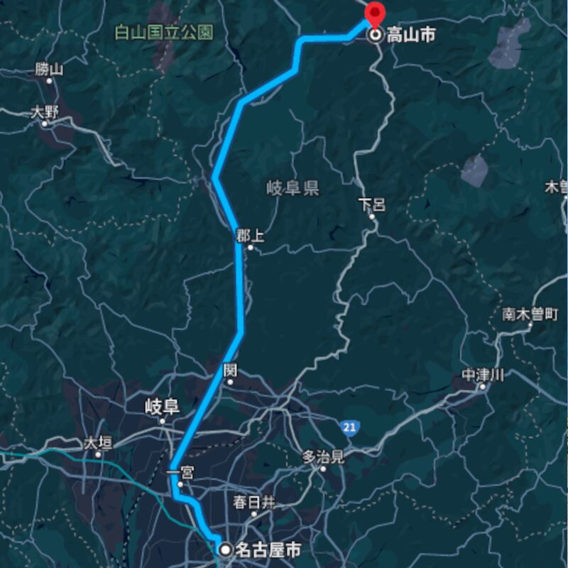 - 路線:名古屋IC → 東海北陸自動車道 → 高山IC
